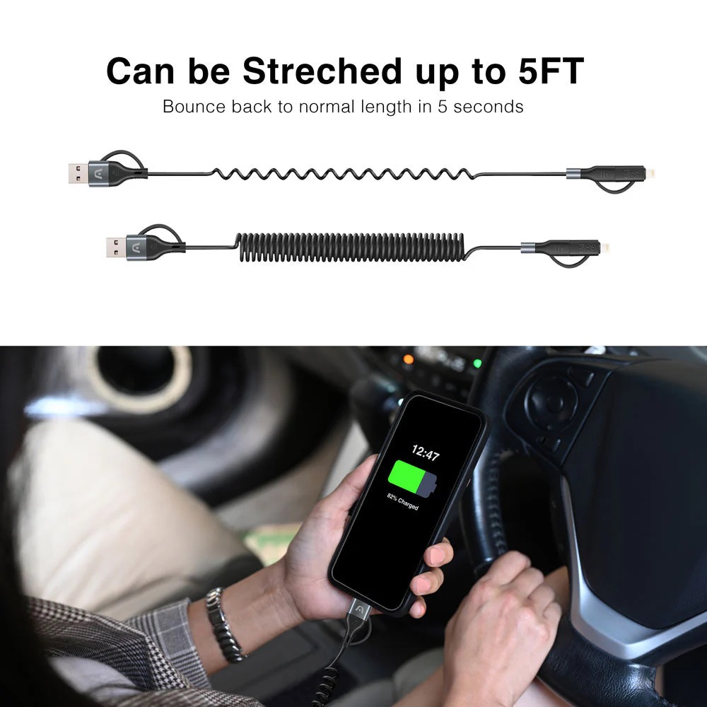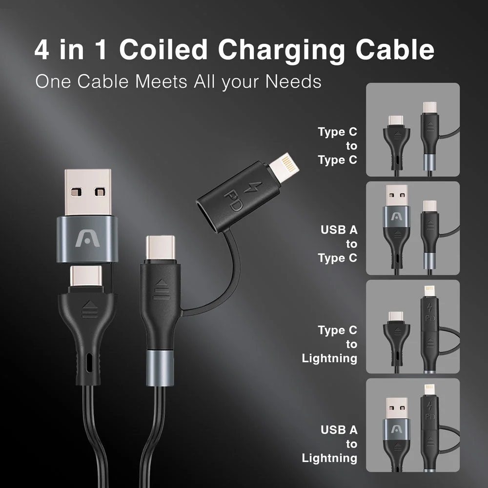 El cable ArgomTech DuraCoil 4 en 1 ofrece máxima versatilidad y portabilidad para cargar tus dispositivos dondequiera que vayas. Con conectores de entrada y salida duales (USB-A + USB-C a USB-C + Lightning), este cable se adapta a prácticamente cualquier dispositivo, ya sea tu smartphone, tableta o sistema de carga del coche.